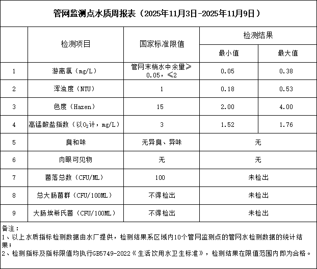 管網(wǎng)監(jiān)測點水質(zhì)周報表(2025年11月3日-2025年11月9日)
