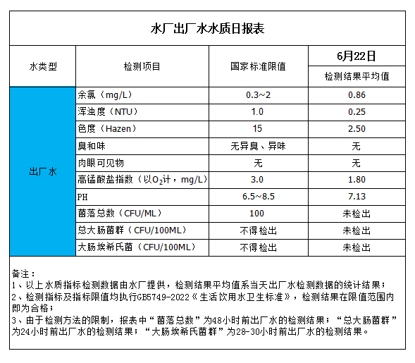 水廠出廠水水質日報表(2023-6-22)